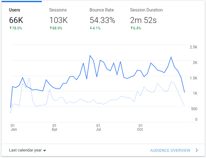 私たちはGoogle Analyticsを使って、ドキュメントサイトから個人を特定できない統計情報を収集しています。 2021年には、1週間に2,000人以上のユニークビジターが訪れることもありました。