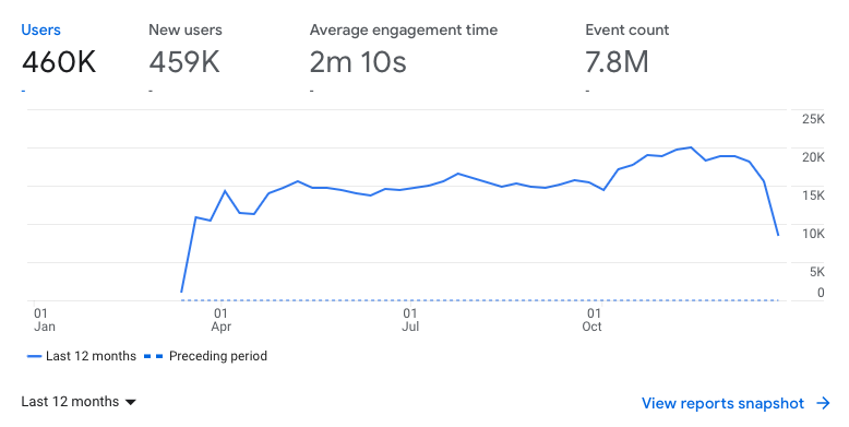Ми збираємо деякі неперсоналізовані статистичні дані з відвідування нашої документації за допомогою Google Analytics. У 2022 році ми іноді мали понад 20,000 унікальних відвідувачів на тиждень. Це в 10 разів більше, ніж у 2021 році!